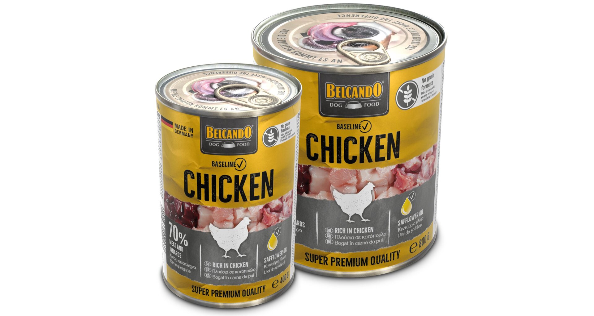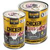 Masové konzervy pro psy s kuřecím masem, bez obilovin. Receptura obsahuje 70 % masa a vnitřností. Kompletní krmivo pro psy.