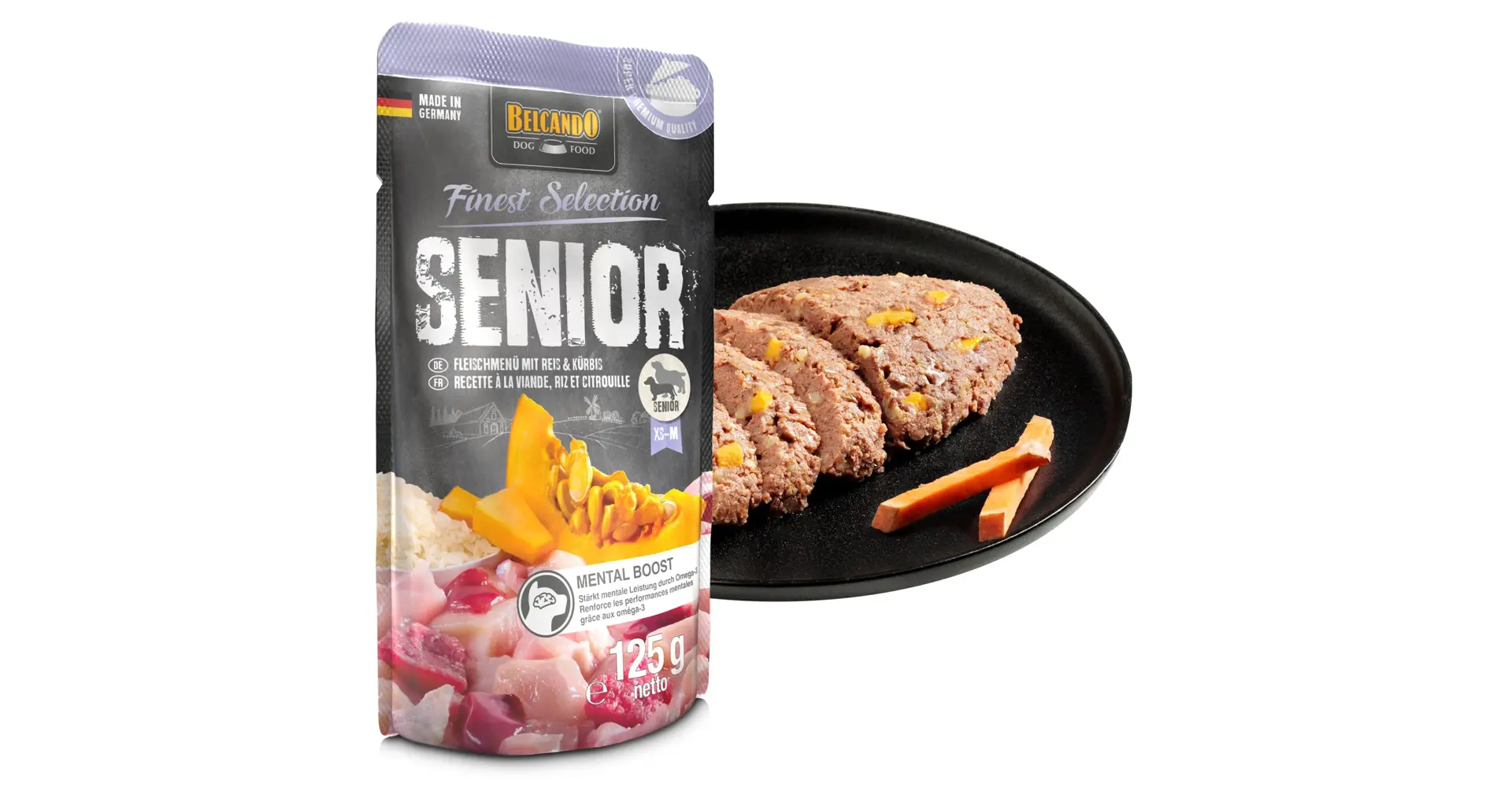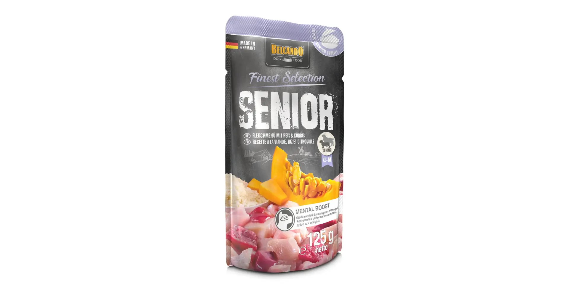 Kapsička pro psí seniory se třemi dobře stravitelnými druhy masa v extra šťavnaté receptuře. Plná kuřecího, telecího a hovězího masa, rýže, dýně a bylinek. Lahodné, lehce stravitelné a šité na míru stárnoucím čumákům.
