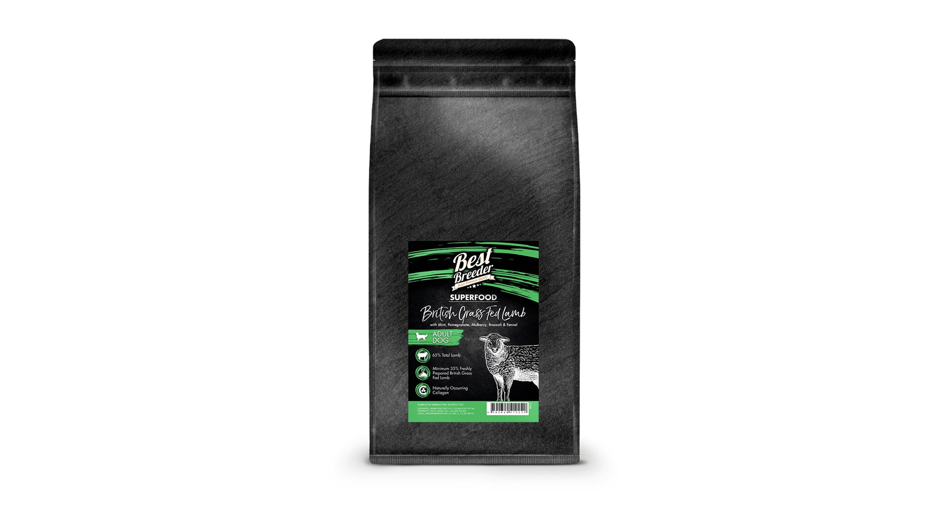 Britské jehně s mátou, granátovým jablkem, morušemi, brokolicí a fenyklem. Kompletní krmivo bez obilovin pro dospělé psy. Dopřejte vašemu parťákovi granule plné masa a superpotravin.