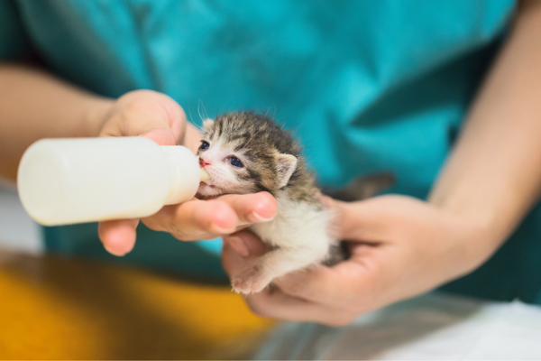 Pokud kočičí maminka z jakéhokoli důvodu nemůže kojit, budete ji muset zastoupit. Zpočátku vás čeká pravidelné krmení kočičím mlékem z lahve velmi často. Kotěcí mléko ohřívejte zhruba na 38 °C, což je teplota těla vašeho malého parťáka.