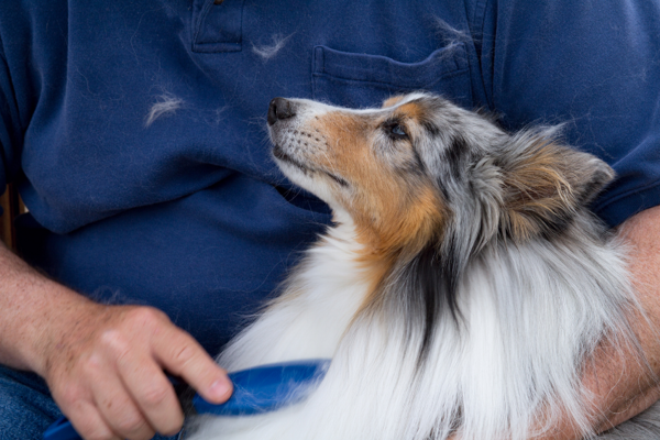 U psů s velmi hustou srstí nejdříve naberte pramen chlupů u pokožky a pročešte jej proti směru růstu. Když takto vykartáčujete celý kožich, pročesejte psa ještě jednou, tentokrát ale po směru růstu.