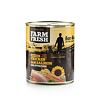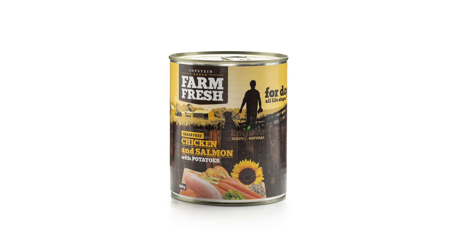 Konzerva pro psy s kuřecím masem, lososem a bramborami.
