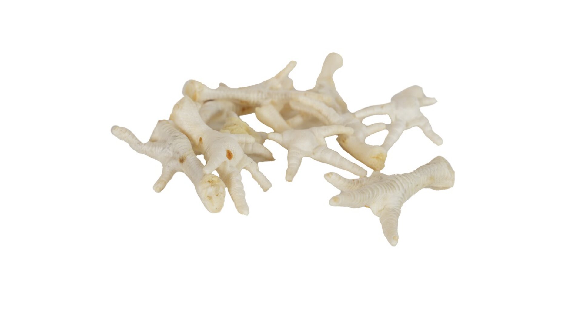 Bílé kuřecí pařáty jsou speciálně sušené kuřecí nožky zbavené většiny tuku a kůže. Díky tomu mají světlou barvu, jsou téměř bez zápachu. Jsou bohaté na kolagen, vápník a další minerály důležité pro zdravé klouby a kosti. Skvělá volba pro psí mlsouny i citlivky – 100% přírodní pochoutka šetrná k bříšku.