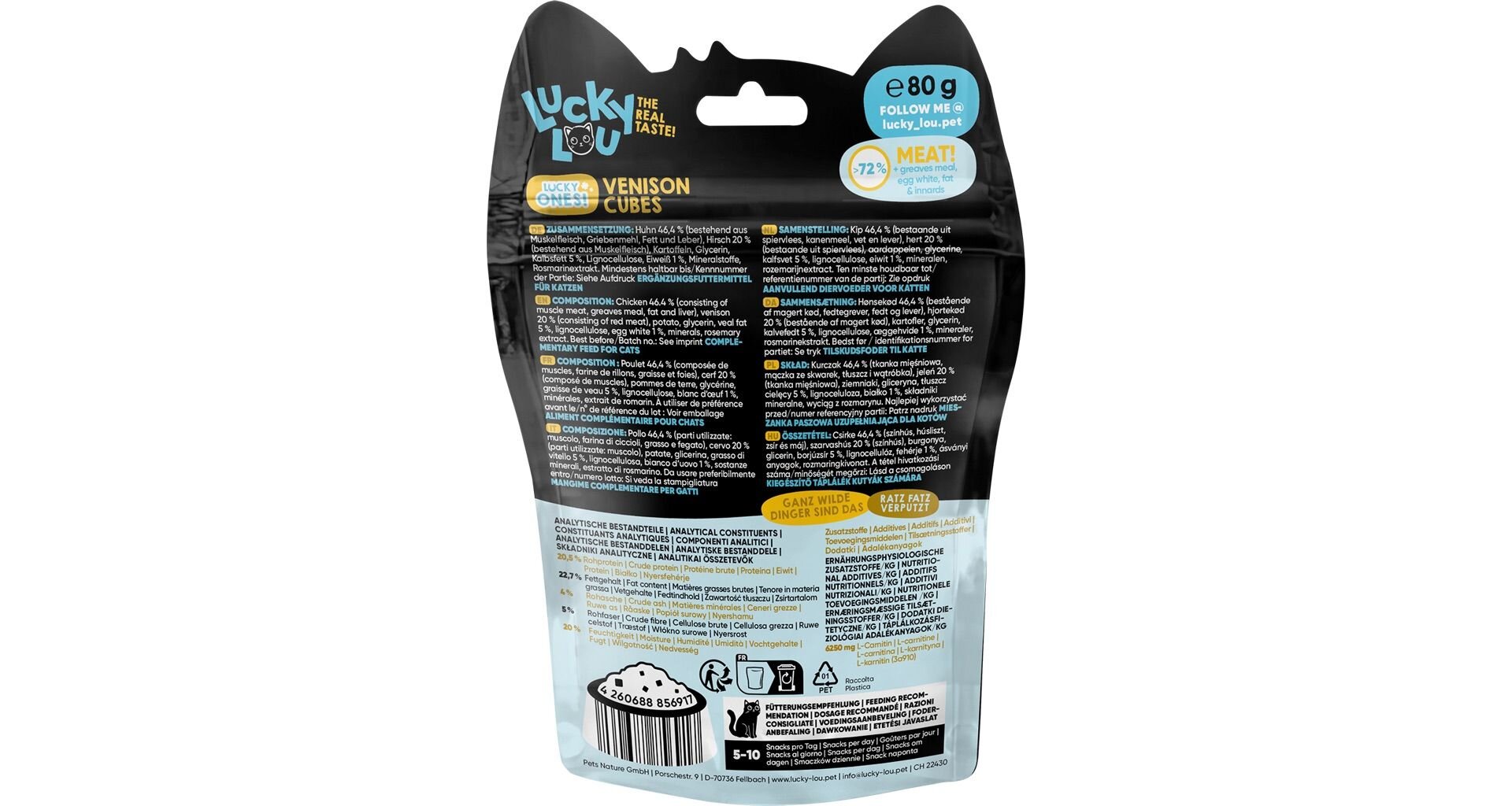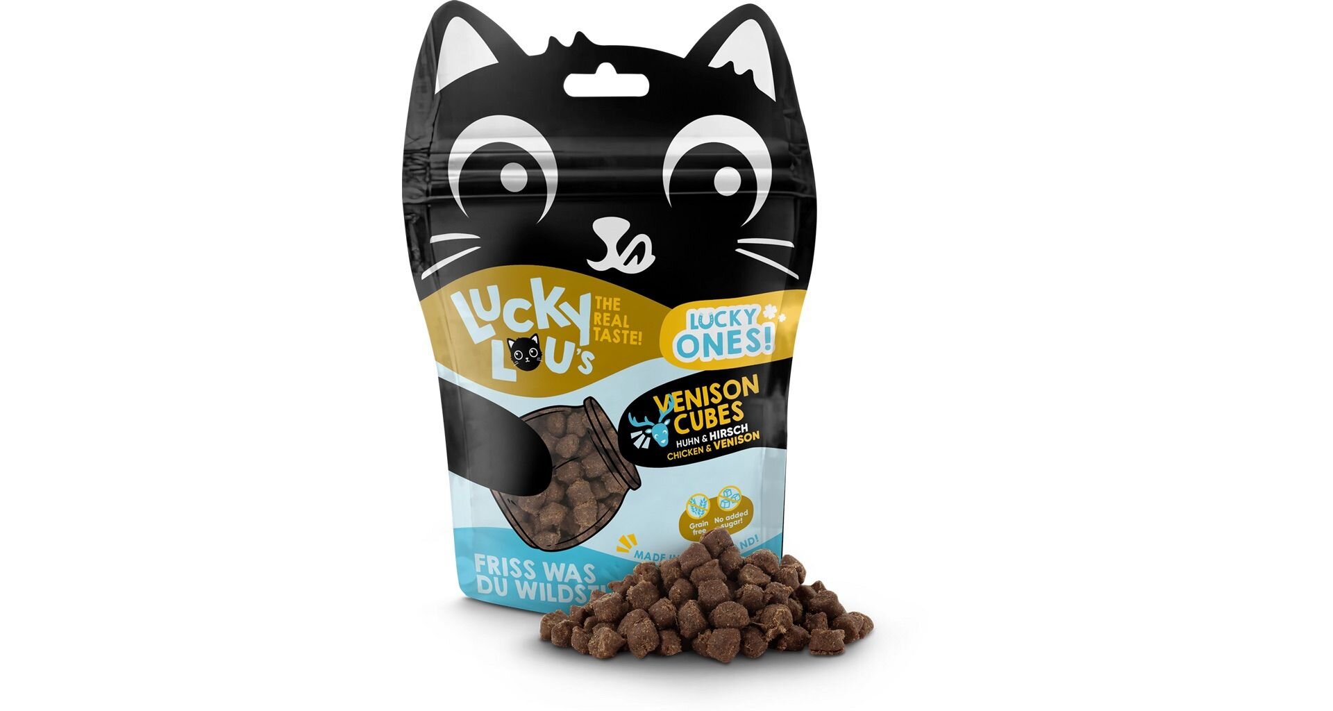 Lucky Ones Cubes jsou šťavnaté kostičky kuřecího a jeleního masa, které se perfektně hodí pro časté odměňování a hru s vaší kočkou. Doplňkové krmivo pro kočky.