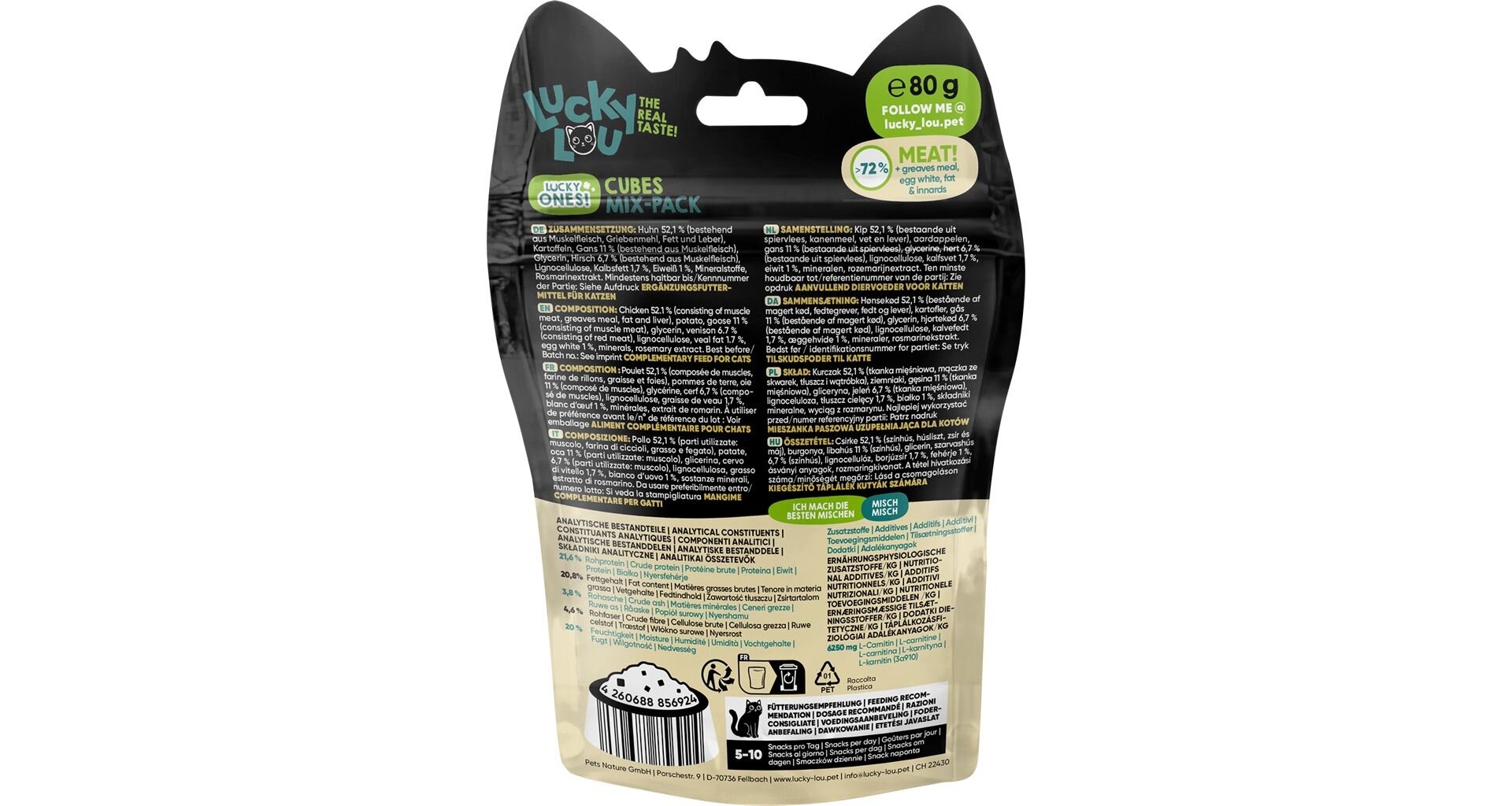 Lucky Ones Cubes jsou šťavnaté kostičky kuřecího, husího a jeleního masa, které se perfektně hodí pro časté odměňování a hru s vaší kočkou. Doplňkové krmivo pro kočky.