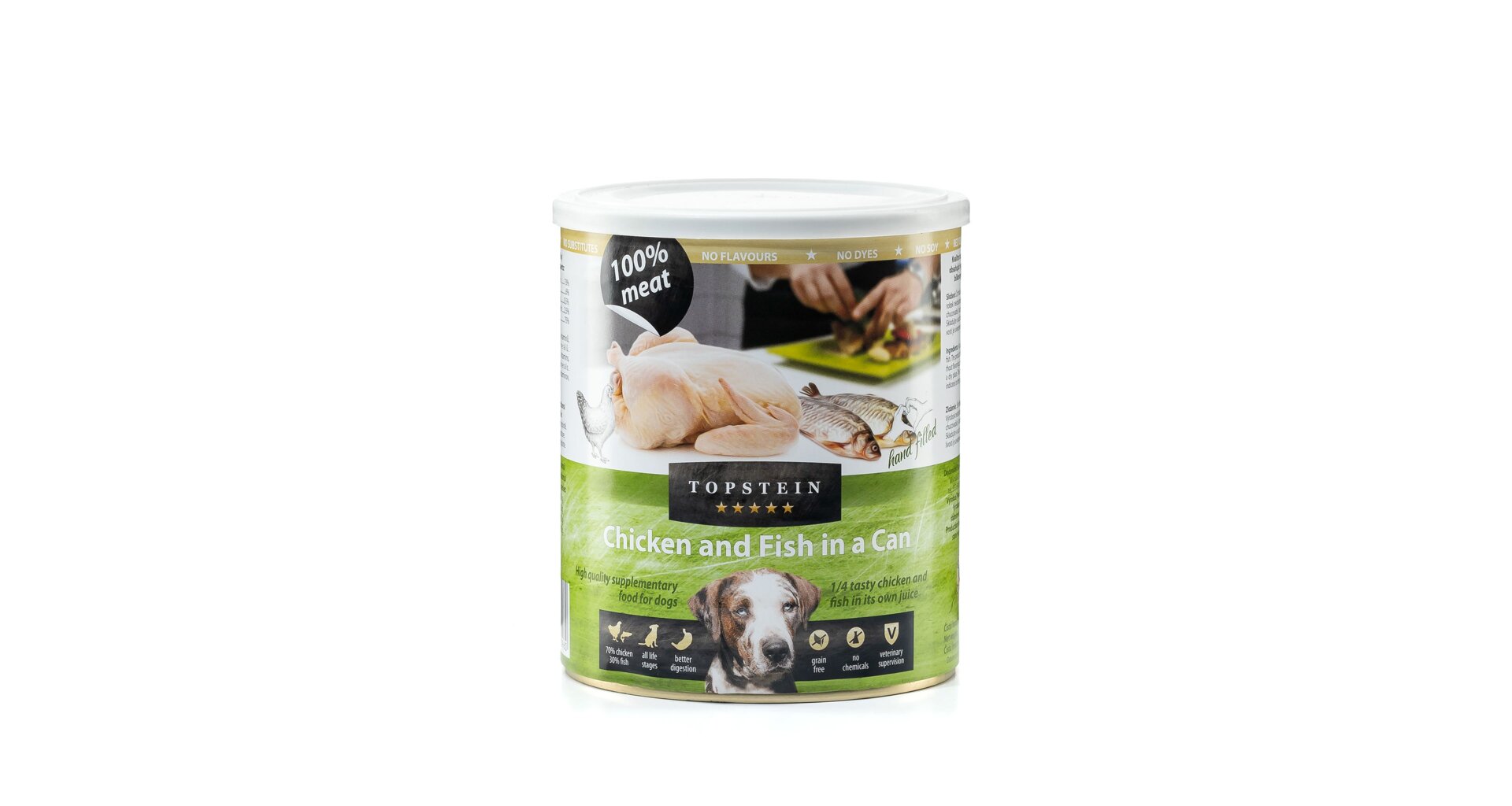 Konzerva pro psy s kuřecím a rybím masem, bez obilovin.