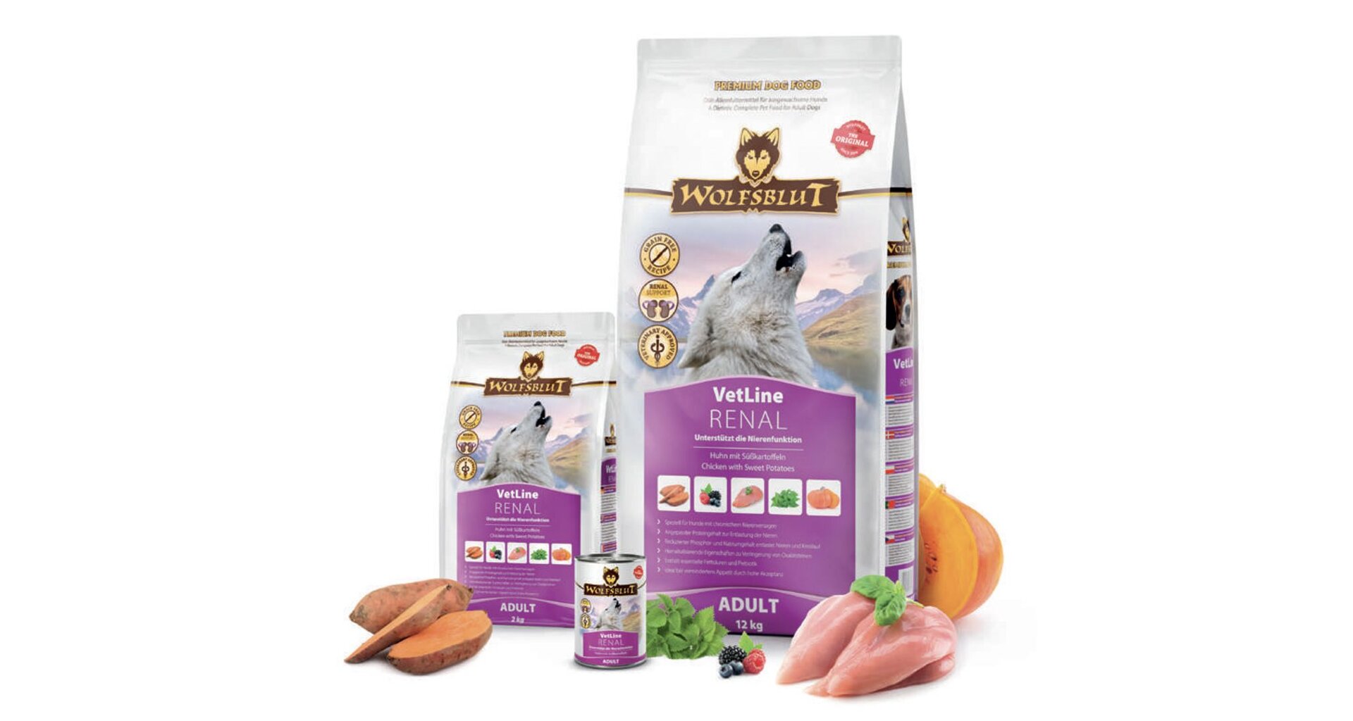 Wolfsblut VetLine Renal je dietní kompletní krmivo pro dospělé psy pro podporu funkce ledvin v případě chronické renální insuficience a pro snížení tvorby oxalátových kamenů.